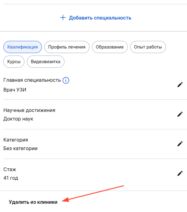 2. Экранның оң жағында дәрігер картасы ашылады, мәзірдің «Удалить из клиники»төменгі жағындағы түймесін басыңыз.