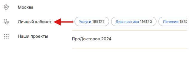 1. Порталға дәрігер ретінде кіріңіз. Ол үшін «Войти»жоғарғы оң жақ бұрышта нұқыңыз және опцияны таңдаңыз «Врач или клиника». Логин мен парольді көрсетіңіз.