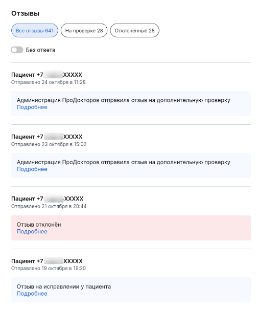Пікірлер әртүрлі бағалаулар мен мәтіндермен болуы мүмкін болғандықтан, жарияланғанға дейін біз авторға дәрігердің немесе емхананың әсерін азайту үшін кері байланыс туралы толық ақпаратты көрсетпейміз. Бірақ нұқу «Подробнее»арқылы пациент пен портал арасында қандай өзара әрекеттесу болғанын, сондай-ақ оны жариялау мүмкін болмаса, кері қайтарып алудан бас тарту себебін білуге болады.