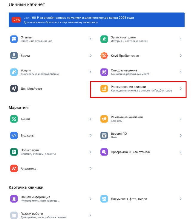 Ұпайлар бөлімде клиниканың жеке кабинетінде «Ранжирование клиники»көрсетіледі .